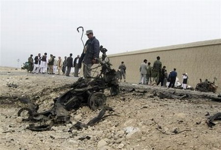File photo shows Afghan policemen at the site of a suicide attack in eastern Afghanistan last Saturday. A bomb planted on a road on Wednesday ripped through a minibus in eastern Afghanistan killing seven passengers, the interior ministry has said, blaming the attack on insurgents. [Agencies]