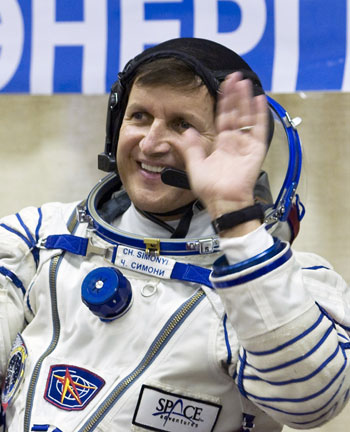 US entrepreneur Charles Simonyi waves to his wife after putting on his space suit at Baikonur Cosmodrome March 26, 2009. [Agencies]