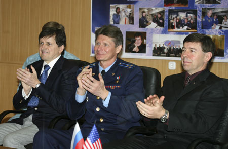 (L-R) US entrepreneur Charles Simonyi, Russian cosmonaut Gennady Padalka and US astronaut Michael Barratt applaud at Baikonur cosmodrome March 25, 2009. [Agencies]