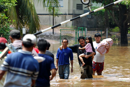 Updated: 2009-03-27 19:44 CIRENDEU -- Torrential rain caused an old dam to burst its banks early Friday, sending a wall of muddy water crashing into a suburb of the Indonesian capital. The flood killed at least 50 people, left scores missing and submerged hundreds of homes.