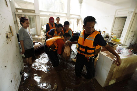 Rescue team carry a body found in a house at the site of a flooded housing complex in south Jakarta March 27, 2009. A dam on the outskirts of the Indonesian capital, Jakarta, burst early on Friday, killing 50 people and flooding hundreds of houses nearby, officials said. [Agencies]