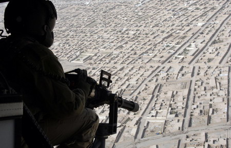 A Canadian soldier door gunner from the NATO-led coalition force, takes position on a CH 146 Griffon helicopter as they fly over a neighbourhood in Kandahar province, southern Afghanistan, March 27, 2009. [Agencies]