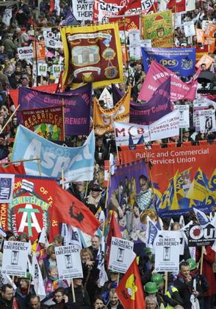 Updated: 2009-03-28 22:28 Demonstrators march through central London March 28, 2009. Thousands of demonstrators marched through London on Saturday to demand action on poverty, jobs and climate change at the start of a week of protests aimed at the G20 summit in the capital. [Agencies] |