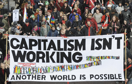 Demonstrators march through central London March 28, 2009. Thousands of demonstrators marched through London on Saturday to demand action on poverty, jobs and climate change at the start of a week of protests aimed at the G20 summit in the capital. [Agencies]