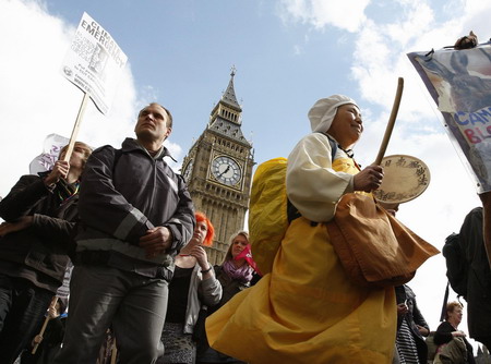 Demonstrators march through central London March 28, 2009. Thousands of demonstrators marched through London on Saturday to demand action on poverty, jobs and climate change at the start of a week of protests aimed at the G20 summit in the capital. [Agencies]