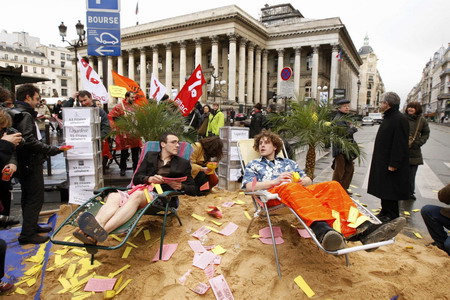 Demonstrators sit on deckchairs in front of the former Paris Stock Exchange during a rally against the upcoming G20 summit, March 28, 2009. [Agencies]