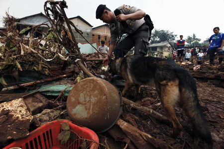 A police officer and his dog search for bodies at a residential area affected by a burst dam on the outskirts of Jakarta March 28, 2009. [Agencies]