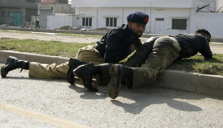 Policemen take cover at the site of a shooting at a police training centre in Lahore March 30, 2009. [Agencies]