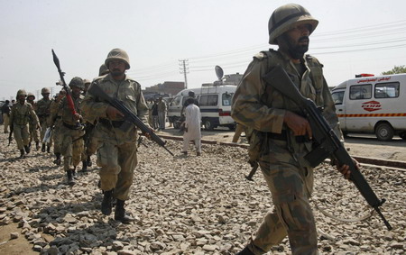 Paramilitary troops arrive at the scene of a shooting near a police training centre in Lahore on March 30, 2009. [Agencies]
