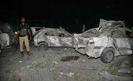 A policeman stands near destroyed vehicles at the site off a bomb attack in a hotel in Peshawar June 9, 2009. [Agencies]