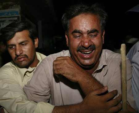 A man cries in a hospital after the bomb attack in a hotel in Peshawar June 9, 2009. At least 11 people were killed and 50 others were injured Tuesday evening when a blast hit a five-star hotel in the northwestern Pakistani city of Peshawar, according to local TV reports. [Agencies]