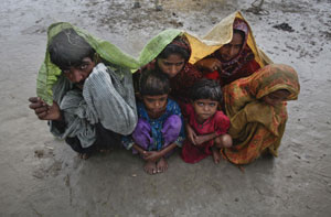Family members, displaced by floods, use a tarp to escape a monsoon downpour while taking shelter at a make-shift camp for flood victims in the Badin district in Pakistan's Sindh province Sept 14, 2011. Floods this year have destroyed or damaged 1.2 million houses and flooded 4.5 million acres (1.8 million hectares) since late last month, according to officials and Western aid groups. More than 300,000 people have been made homeless and about 200 have been killed. [Photo/Agencies]