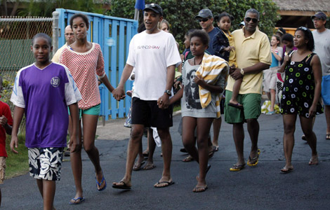 US President Barack Obama and his daughters Sasha and Malia (L) walk with friends during their visit to Sea Life Park in Waimanalo, Hawaii, Dec 27, 2011. [Photo/Agencies] |