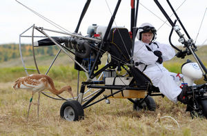 Russian President Vladimir Putin (front) sits in a motorised deltaplane as a crane is seen next to it at Yamalo-Nenets district September 5, 2012. [Photo/Agencies]