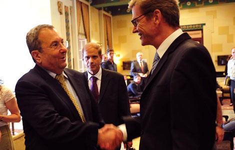 Israeli Defense Minister Ehud Barak (L) shakes hands with visiting German Foreign Minister Guido Westerwelle during a meeting with him in Jerusalem on Sept 9, 2012. [Photo/Xinhua]