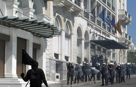 A protestor clashes with anti-riot policemen in Athens, Greece, Sept 26, 2012. Clashes broke out on Wednesday afternoon in central Athens, the Greek capital, during a rally organized by labor unions and Left parties against planned fresh austerity measures in exchange for further international financial aid. [Photo/Xinhua]