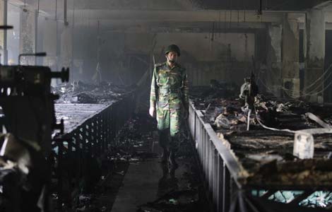An army personnel inspects the burnt interior of a garment factory after a fire in Savar Nov 25, 2012. [Photo/Agencies]