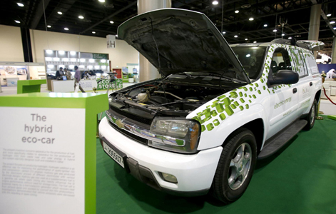 A Chevrolet Blazer hybrid test car is seen at a display of environmentally friendly vehicles by the Gulf Organisation for Research and Development (GORD) in Doha.