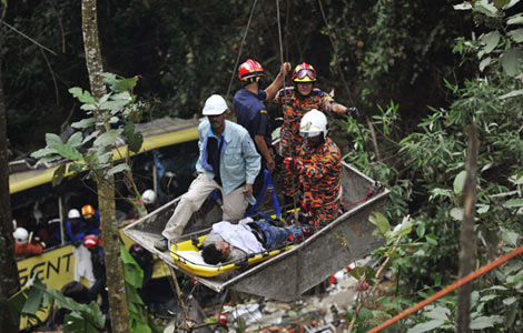 Rescuers work at the scene of a bus crash at Genting Highlands, 55 km (34 miles) from Kuala Lumpur, August 21, 2013.[Photo/Agencies] |
