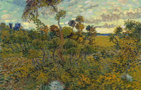 A painting titled "Sunset at Montmajour" is seen in this handout photo received from The Van Gogh Museum in Amsterdam on Sept 9, 2013. The French landscape painting stored in an attic and kept from public view for a century because it was considered a fake is the work of Dutch master Vincent Van Gogh, a museum said on Monday citing new research. "Sunset at Montmajour", which shows twisted holly oaks and a distant ruin bathed in the light of the setting sun, was painted in 1888 when Van Gogh was living in Arles, in the south of France. The work, owned by a private collector, will go on show at the Van Gogh Museum in Amsterdam later this month for a year. [Photo/Agencies] |