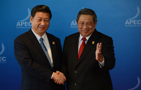 Australian Foreign Minister Julie Bishop (left), Japanese Foreign Minister Fumio Kishida (center) and US Secretary of State John Kerry pose for photos at their trilateral meeting ahead of the APEC forum in Bali on Friday.[Dita Alangkara/Reuters ] |