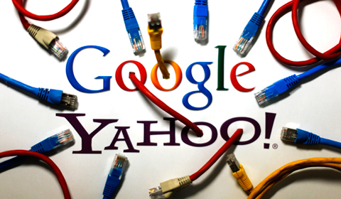 An illustration picture shows the logos of Google and Yahoo connected with LAN cables in a Berlin office October 31, 2013. [Photo/Agencies] |