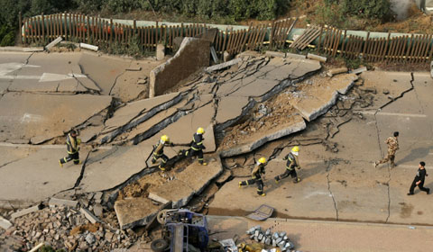An anti-government protester sprays unknown substance over the barricade during clashes with police near the Government house in Bangkok December 1, 2013. [Photo/Agencies] |