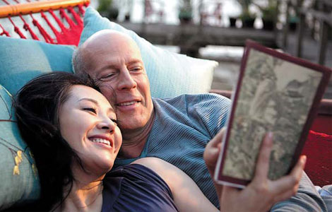 US film star Bruce Willis (right) reads a book with Chinese actress Xu Qing in a scene from the movie Looper. Hollywood has paid increasing attention to the Chinese market, which is expected to be the world's biggest box office in less than 10 years. Provided to China Daily |