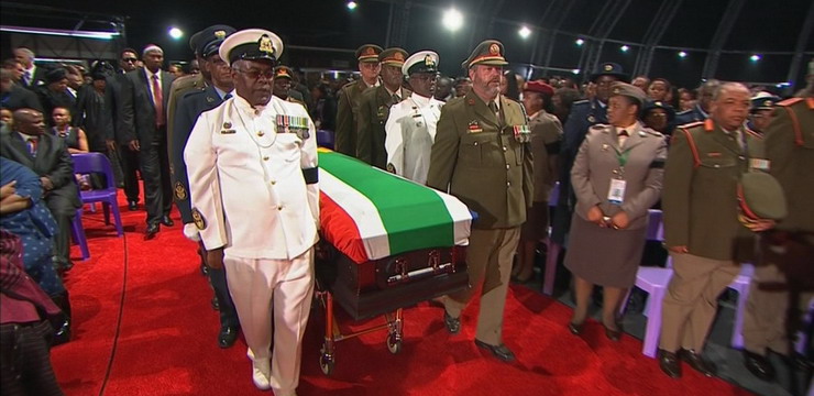 South African President Jacob Zuma (C) wipes his tears while sitting beside Mandela's widow Graca Machel (L) and Mandela's ex-wife Winnie Mandela during a send-off ceremony for late former South African President Nelson Mandela at Waterkloof Air Force base in Pretoria December 14, 2013.