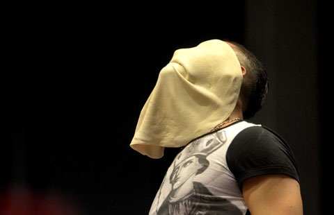 Bradley Johnson, of the United States, performs with his dough during the freestyle event, part of the Pizza World Championships, in Parma, northern Italy, April 9, 2014. [Photo/icpress.cn]