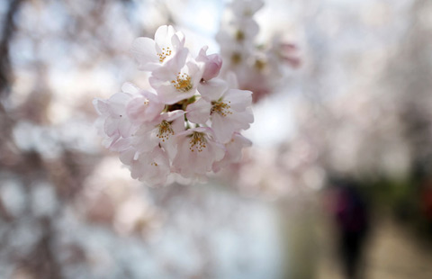 People walk amongst the famed cherry blossoms along the Tidal Basin in Washington April 9, 2014. Washington's display of renowned cherry trees started as a gift from Japan 102 years ago. [Photo/Agencies]