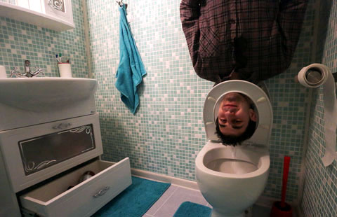 Girl poses in the playroom of the museum "House upside down" opened recently in Saint Petersburg, Russia, April 11. This museum presents an apartment where everything is turned head over heels. [Photo/icpress.cn]