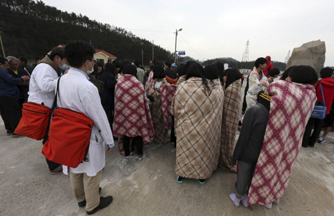 Rescued passengers wrapped in blankets, who were on a sinking ferry "Sewol" in the sea off Jindo, gather at a port in Seogeochado, April 16, 2014. [Photo/Agencies]