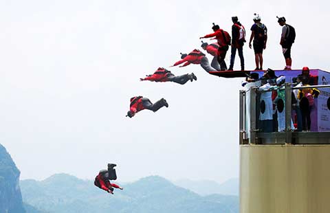 Workers hang outside the clock face as they clean the face of the clocktower popularly known as Big Ben at the Houses of Parliament in London, Monday, Aug 18, 2014, as they undertake essential maintenance and cleaning of the four faces of the clock. [Photo/IC]