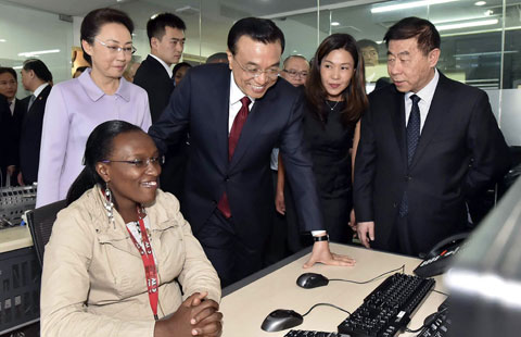 Chinese Premier Li Keqiang (C) talks with staff members during his visit to the office of the African branch of China Central Television (CCTV)in Nairobi, Kenya, May 11, 2014.