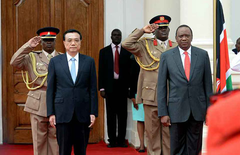 Li Keqiang stands with Kenyan President Uhuru Kenyatta during the welcome ceremony in Kenya on May 10, 2014.