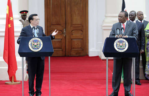 Premier Li Keqiang speaks to Kenyan President Uhuru Kenyatta at a meeting in Nairobi, capital of Kenya, on May 10, 2014.