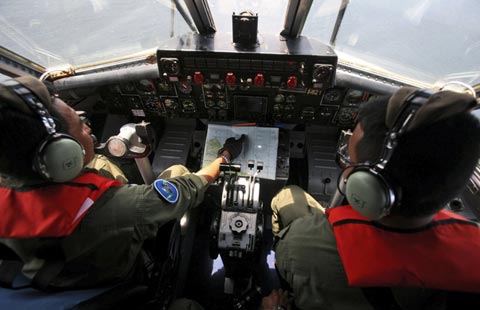 Indonesian Navy pilots Maj. Bambang Edi Saputro, left, and 2nd Lt. Tri Laksono check their map during a search operation for the missing Malaysian Airlines Boeing 777 over the waters bordering Indonesia, Malaysia and Thailand near the Malacca straits, March 10, 2014.
