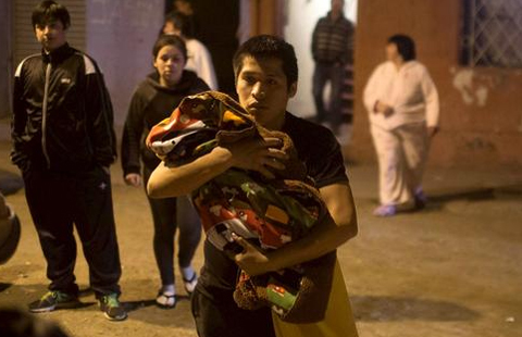 People stand and watch the ocean on Cerro Baron hill, in Valparaiso city,Chile on Sept 16, 2015, after a mass evacuation of the entire coastline during a tsunami alert after a magnitude 8.3 earthquake hit off the coast of Chile on Wednesday. [Photo/ Agencies]