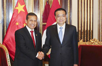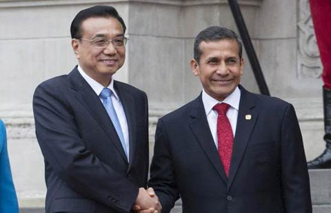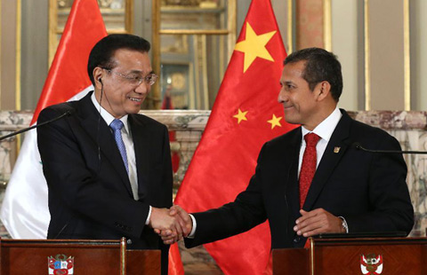 Premier Li Keqiang shakes hands with Peru's President Ollanta Humala in Lima, capital of Peru, May 22, 2015.