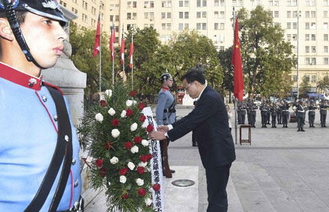 Chinese Premier Li Keqiang attends a wreath-laying ceremony at Bernardo O'Higgins Monument in Santiago, capital of Chile, May 25, 2015.