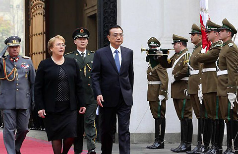 Premier Li Keqiang is welcomed by Chilean President Michelle Bachelet at the presidential palace in Santiago on May 25. The two leaders also watched a parade of honor guards.