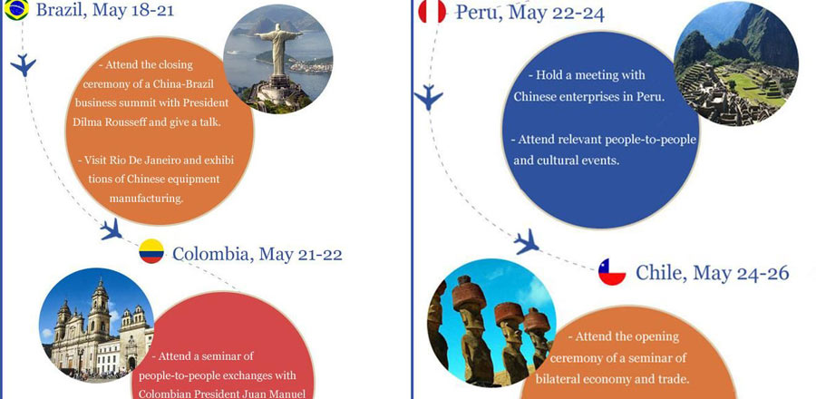 Chinese Premier Li Keqiang left Beijing on Sunday to start his official visit to Brazil, Colombia, Peru and Chile, with stopovers in Ireland and Spain.