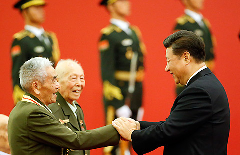 President Xi Jinping on Tuesday called on people of the mainland and Taiwan to unite to safeguard peace, as he met with a Taiwanese political delegation to attend events for the 70th anniversary of the end of World War II.