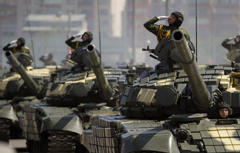Belarussian servicemen ride in World War II tanks as they take part in a military parade, during celebrations marking Independence Day, in Minsk July 3, 2013.