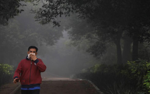 A man covers his face with a handkerchief as he walks in a park on a smoggy morning in New Delhi, India, Nov 9, 2017. [Photo/Agencies] |