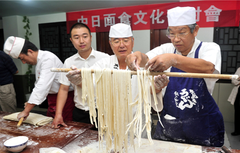 A Japanese chef competes with Chinese chefs during a Chinese pasta cooking contest in Xi'an, Shaanxi province, Sept 19, 2013.