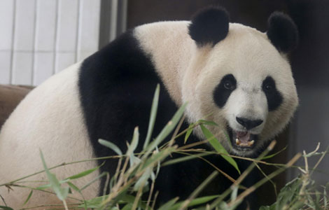 Pregnant giant panda Shin Shin eats bamboo leaves at Tokyo's Ueno Zoo on June 27.