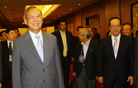 Zeng Peiyan, China's former Vice-Premier talks with Yasuo Fukuda, former Japanese Prime Minister, who is attending the 8th Beijing-Tokyo Forum which kicked off in Tokyo on Monday.