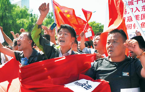 Thousands of people in Beijing marched to the well-guarded Japanese embassy, chanting slogans including "Never forget the national humiliation".